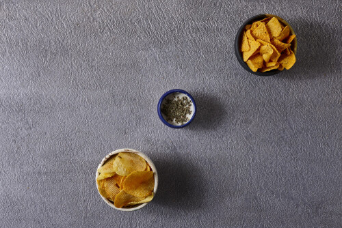 Assorted snacks in pottery bowls on grey background