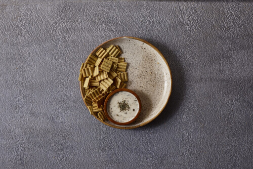 Assorted snacks in pottery bowls on grey background