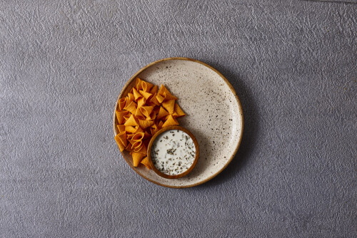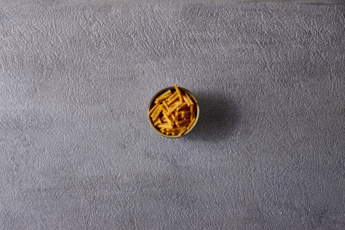 Assorted snacks in pottery bowls on grey background