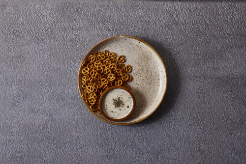Assorted snacks in pottery bowls on grey background
