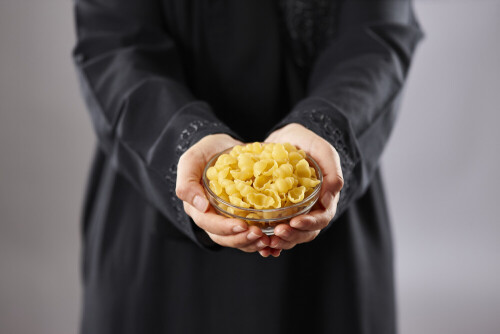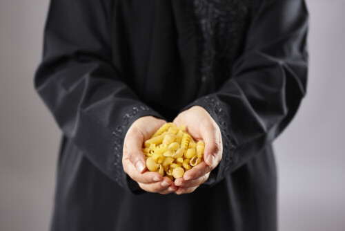 Woman in abaya holding different kinds of pasta in different positions