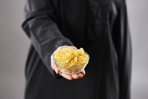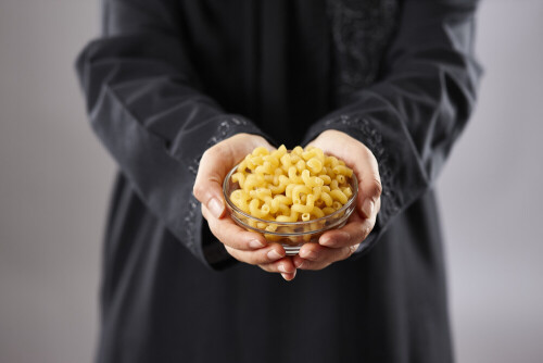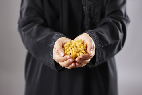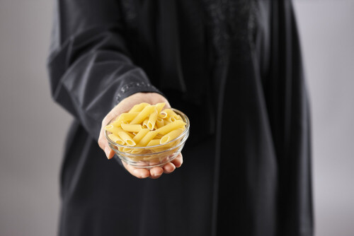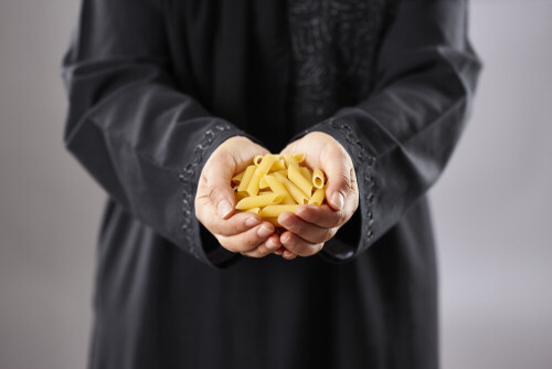 Woman in abaya holding different kinds of pasta in different positions