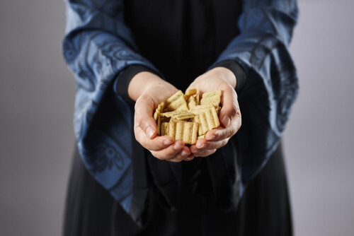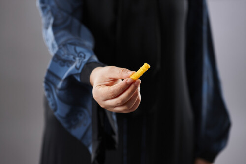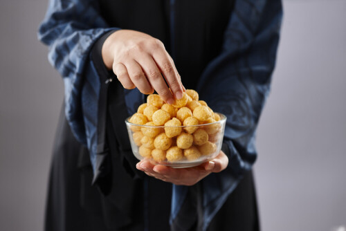 Woman in abaya holding different kinds of snacks in different positions