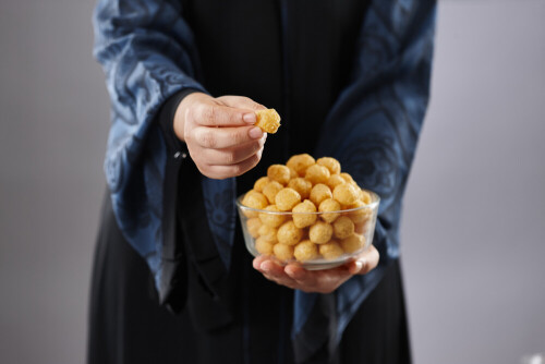 Woman in abaya holding different kinds of snacks in different positions