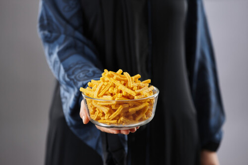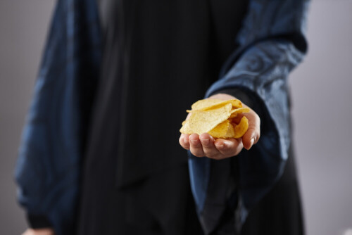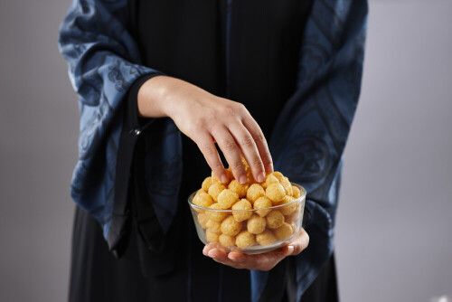 Woman in abaya holding different kinds of snacks in different positions