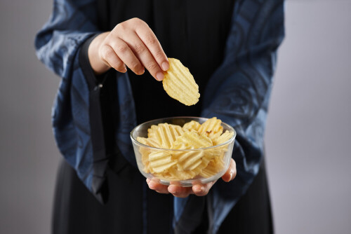 Woman in abaya holding different kinds of snacks in different positions