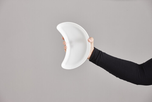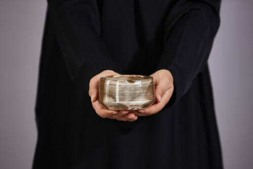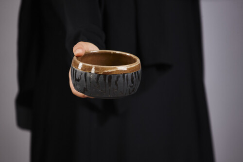 A woman in black abaya holding different pottery essentials in different positions