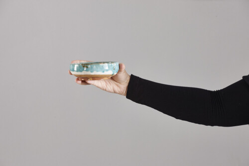 A woman in black abaya holding different pottery essentials in different positions