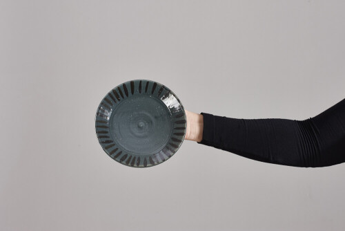 A woman in black abaya holding different pottery essentials in different positions