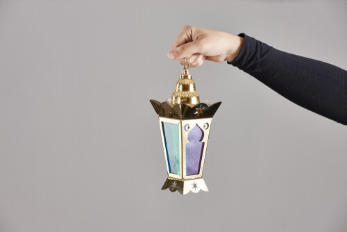 A woman in black abaya holding different ramadan lanterns in different positions