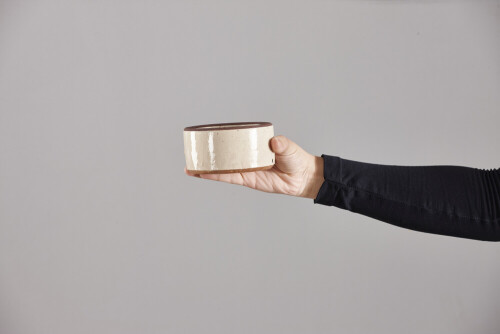 multi-colored pottery Plate placed on a rectangular wooden tray