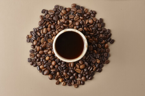 A beige pottery cup of coffee surrounded by roasted coffee beans on beige background