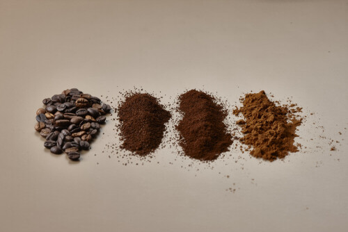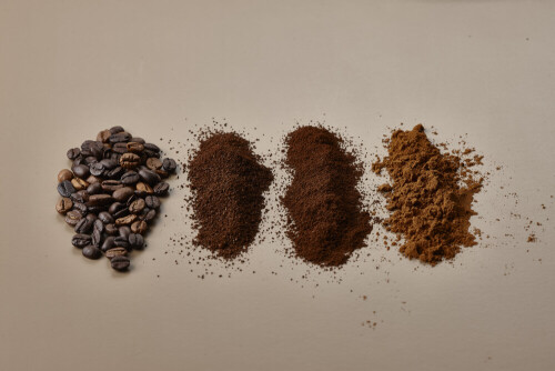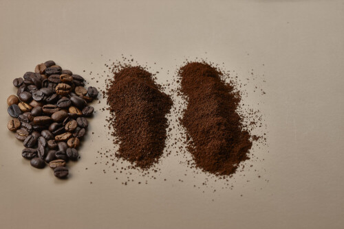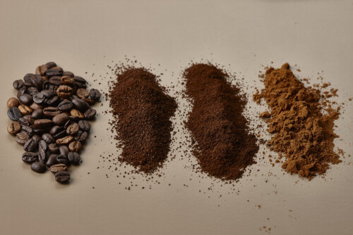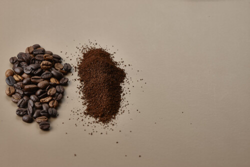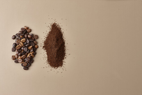 Assorted kinds of coffee such as roasted beans and ground on beige background