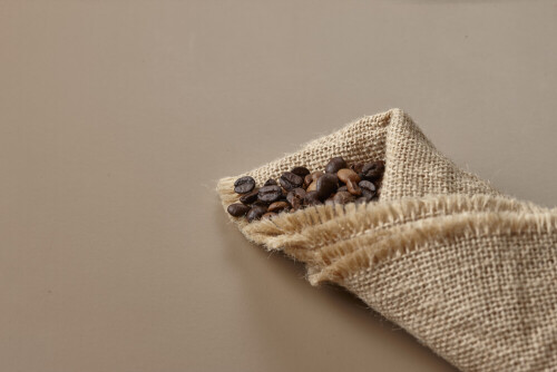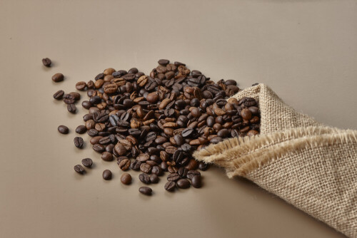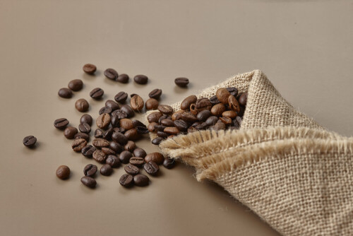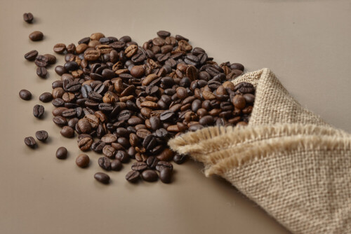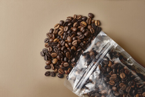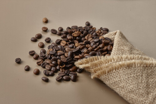 Spilled roasted coffee beans from its pack on beige background