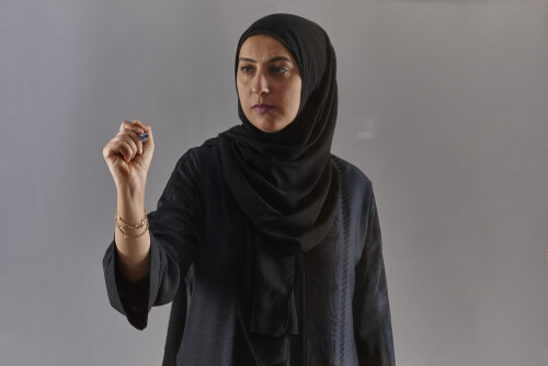 Woman in black abaya and hijab holding a marker pen to write on a transparent board with different reactions and expressions on grey background