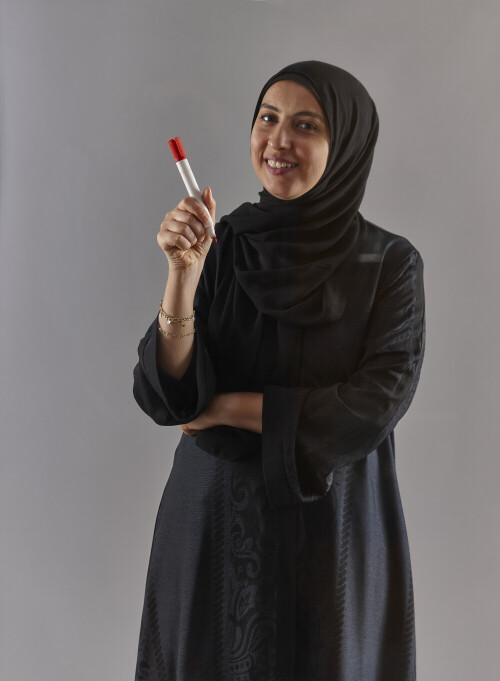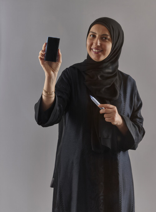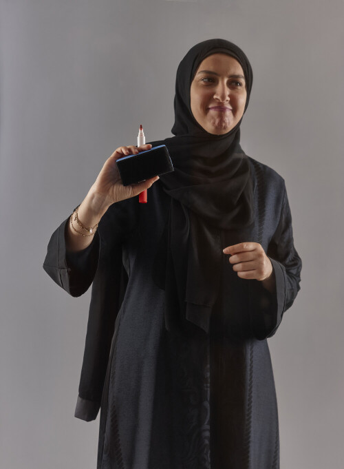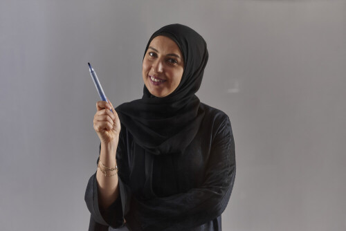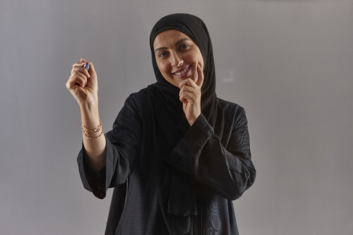 Woman in black abaya and hijab holding a marker pen to write on a transparent board with different reactions and expressions on grey background