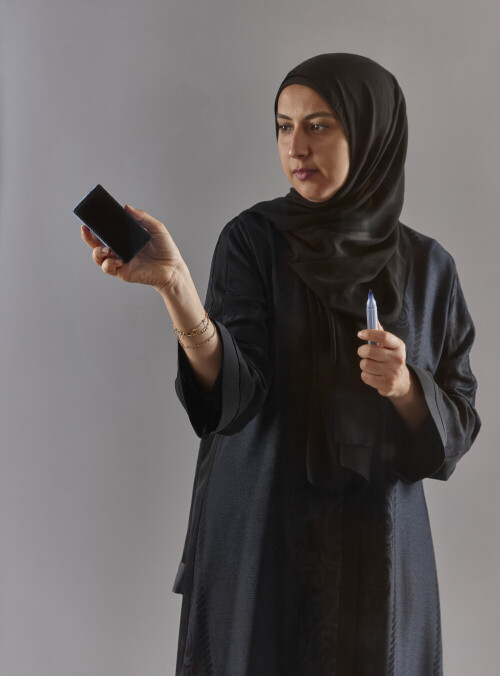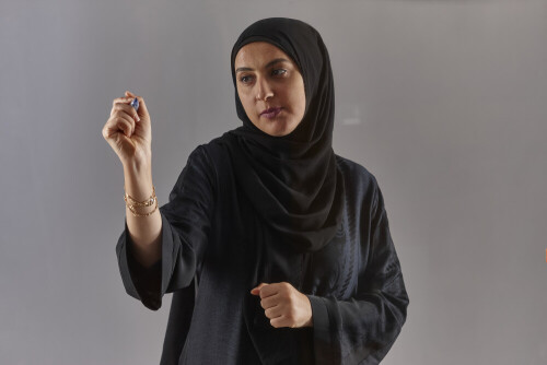 Woman in black abaya and hijab holding a marker pen to write on a transparent board with different reactions and expressions on grey background