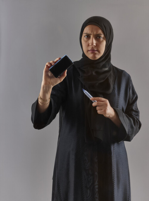 Woman in black abaya and hijab holding a marker pen to write on a transparent board with different reactions and expressions on grey background