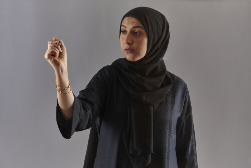 Woman in black abaya and hijab holding a marker pen to write on a transparent board with different reactions and expressions on grey background