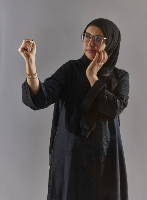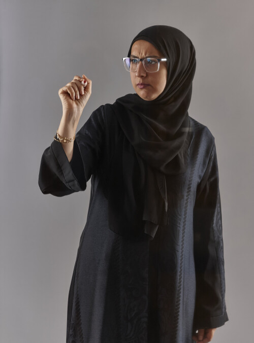 Woman in black abaya, hijab and glasses holding a marker pen to write on a transparent board with different reactions and expressions on grey background