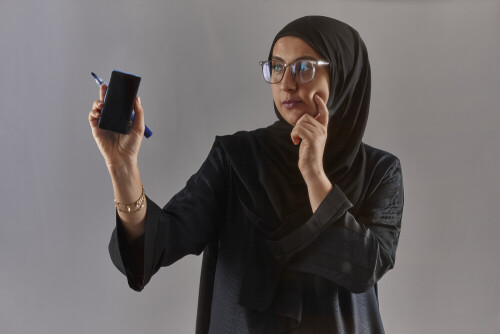 Woman in black abaya, hijab and glasses holding a marker pen to write on a transparent board with different reactions and expressions on grey background