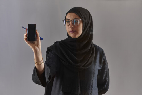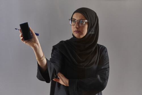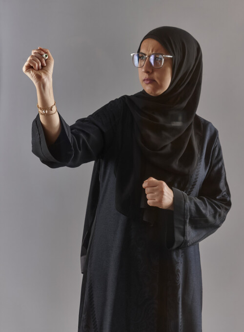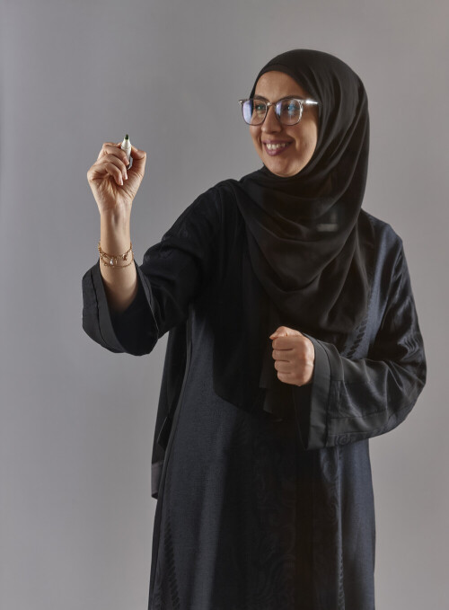 Woman in black abaya, hijab and glasses holding a marker pen to write on a transparent board with different reactions and expressions on grey background