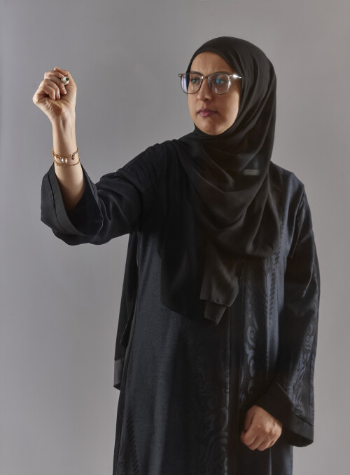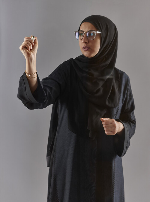 Woman In Abaya Writing On Transparent Board