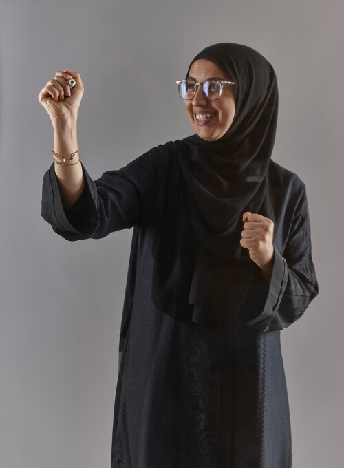 Woman in abaya writing on transparent board