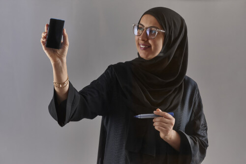 Woman in abaya writing on transparent board
