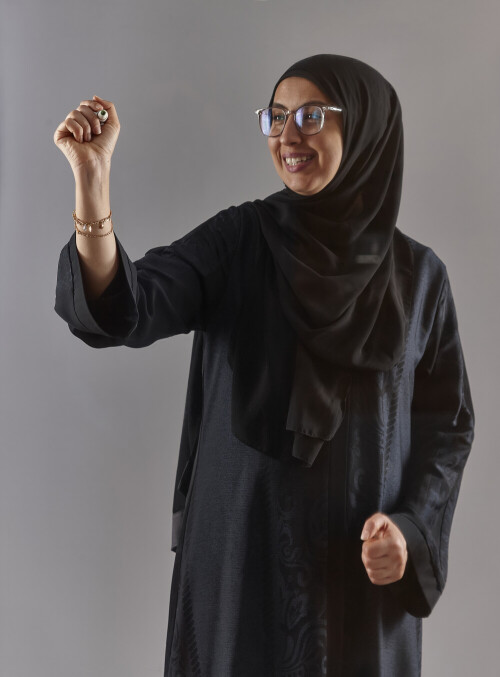 Woman in abaya writing on transparent board