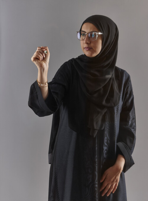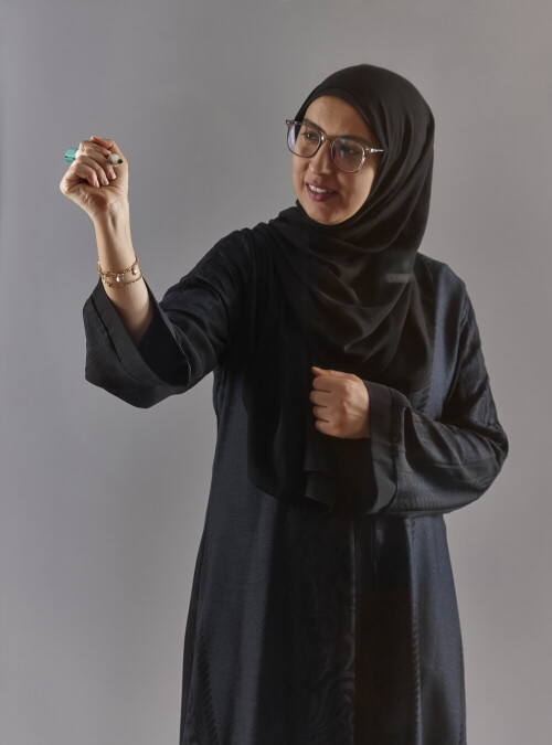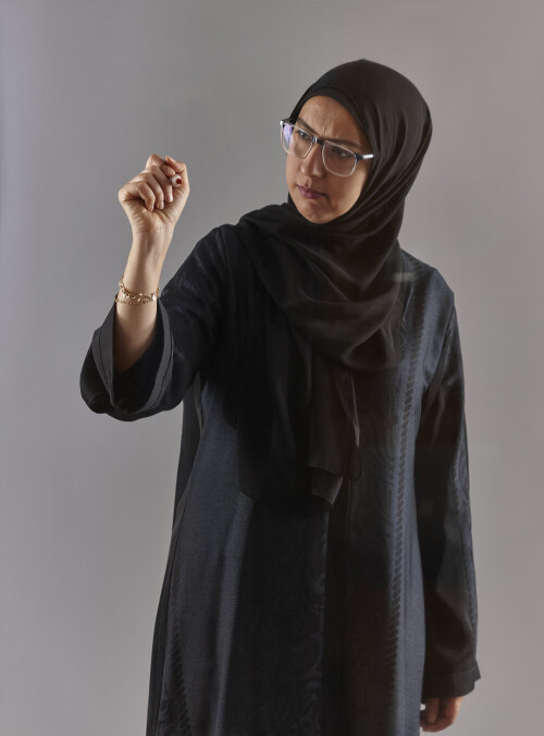 Woman in abaya writing on transparent board